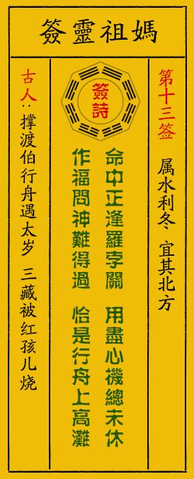 【台湾北海观音明善堂】命中正遇到“罗孛”凶星,虽然用尽心机也避免不了,就是问神祈福,还是躲不过去,正像行船遇到沙滩,进退不得。此签暗示需要更多的行善布施功德来增加福份。才能减轻灾难。求得此签暗示目前福报不好,正处于进退维谷的时候。问事求谋不可。问出外移居,不吉。老年人求得此签暗示,表示一生白费心机,老来已无甚希望。若年轻人求得此签暗示,不必难过,这正是考验你的时刻,只要能克服困难,自有光明前途。问功名,要充实你自己,目前希望不大。问婚姻,缘份未到恐难成功,不宜勉强。问疾病,犯太岁者谨防意外,病慎医治,少年人尚无碍,若老年人,则有阴邪元辰暗淡,宜求神消灾解厄。 【台湾育德妈祖同修会】命中正遇到“罗孛”凶星的关头,虽然你用尽心机也避免不了,就是问神祈福,还是躲不过去,正像行船遇到沙滩,进退不得。抽到此签,表示你目前正在进退维谷的时候。问出外移居,不吉。老年人抽到此签,表示一生空费心机,老来已无甚希望。若年青人抽到此签,不必难过,正是考验你的时候。只要你能克服困难,自有一光明前程。问功名,还是要充实自己,目前希望不大,问婚姻,缘份未到恐难成,不宜勉强。问疾病,须谨慎医治,少年人尚无碍,若老年人,则恐有问题。  |