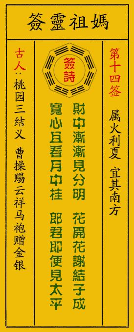 【台湾北海观音明善堂】即将来临的财运或好运已渐渐明显,正像那花开花谢后,结满了果实一样。无须焦急不安,且宽心等待中秋节的到来,你所企盼的愿望将会圆满达成。求得此签暗示目前福报尚平平,问事求谋,宜求神明祈福可得圆满。如问事业,表示已有转机,财运也将慢慢到来即使目前财利不显,但只要耕耘,必有收获。只怕不肯用心努力,随世浮沉,就像那花开花谢,月亮盈亏,得失相伴。问功名,也是一样,如果不去充实自己,只想碰运气,是难得有成就的。问婚姻,有情人终成眷属,婚姻可成。问诉讼,只要出于至诚,必能平安无事,能破财消灾。问疾病,危险有阴邪元辰暗淡,宜消灾。 【台湾育德妈祖同修会】财运来临渐渐显明,正像那花开花谢后,结成满树的果实。不必焦急,且宽心等待中秋节到来,你所等待的郎君将与你共渡那太平惬意的日子了!至友李君出国久无音讯,其夫人至妈祖庙抽得此签,不久,在中秋前夕,李君自国外归来,正应了第三、四句,传为奇谈。抽到此签,如问事业,表示你的事业已有转机,你的财运也将慢慢到来,即使目前财利不显,但只要耕耘,必有收获。只怕不可用心,随世浮沉,就像那花开花谢,月亮盈亏,得失相半。问功名,也是一样,如果不去充实自己,只想碰运气,是难得成就的。问婚姻,有情人终成眷属之兆,婚谈可成。问诉讼,只要出以至诚,必能平安无事,能破财消灾,是为上策,意气之争,得不偿失。  |
