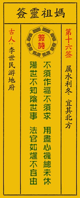 | 诗曰 | 不须作福不须求、用尽心机总未休、阳世不知阴世事、官法如炉不自由。 |