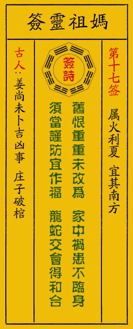 【台湾北海观音明善堂】忆起往事相同的问题与同样错误反覆循环,仍没能改变自己的修为,即使发生的灾祸,没有伤到自身,但可能已伤了他人,从此,你必须要谨慎提防再有类似问题的错误与事故发生,最好多行善事来增添幅报,必能逢凶化吉,而且在辰巳(龙,蛇年或三,四月)交会的时刻,必得到很圆满的结果。求得此签暗示目前福报将尽,问事求谋难成。告诉求签者,必须佛前忏悔自省检讨以前犯的错误,改变作为。避免再犯相同或类似的错误。而且不论经历多少次的失败,辛酸,无数次的恨事,都要不灰心,不断努力去做,改过迁"善。必定有出人头地的一天。此签有贵人助,但必须谦虚求教,签诗言:“须当谨防宜作福”,要防事故再发生必须求神作福,才能得神明及贵人之助逢凶化吉,并得天赋"奇"运。问功名,只要准备充分,即使遭受挫折,算不得什么,再次必取。问婚姻,缘份巳到,婚姻可成。出外不吉无利可图。移居,随意可行。问疾病,求神自安,医遇贵人。 【台湾育德妈祖同修会】回忆往事,心头旧恨重重未消除,正如家中发生灾祸,虽然没有临到本身,但此恨绵绵无尽期。你须要谨慎提防有事故发生,最如多作好事,只要有善因,必能逢凶化吉,而且在辰巳交会的时刻,得到很圆满的结果。此签暗示抽签的人,即使经历了无数次的失败,无数次的辛酸,无数次的恨事,但不必去记挂它,还是东山再起,再振作努力去干,必有出人头地的一天,此签有贵人,但必须心好田好,所以签诗说:“须当谨防宜作福。”只要心地良好,必能逢凶化吉,化险为夷,并得天赋福运。问功名,只要充分准备,即使一次挫折,算不得什么,再次必取。问婚姻,缘份已到,婚谈可成。出外不吉,无利可图。移居,随意可行。  |