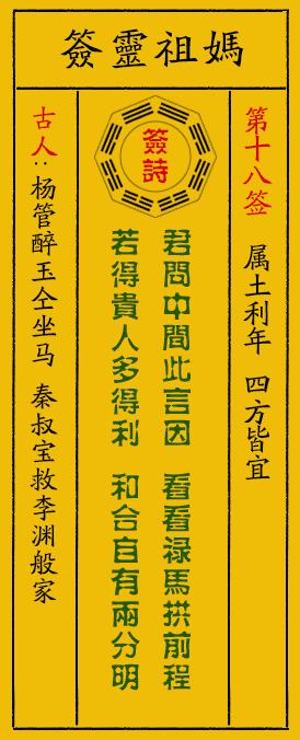 【台湾北海观音明善堂】求得此签暗示累积的福报,问事求谋将有收获。你的心地良善,上天因你平日一心向上,若能再多拜神修福,热心公益。累积善因善心,自有更多的福报,做事求财,自然会有神明及贵人帮助你成功圆满顺遂。问功名,这是大吉之兆,可以积极去发辉,表现你的才能,你未来前程光明远大,自不在话下。问婚姻,只要两情相悦,婚谈必可有情人终成眷属。如果年届中年仍未婚,必定能在近期获得佳音。移居,出外,行船,凡事求和,均吉。此签惟问疾病不吉,男无妨女危险求神渐渐痊愈。 【台湾育德妈祖同修会】如果你要问这中间的因果,请看看“禄马贵人”帮助你前程的发展,就可领悟。如果你能得到“贵人”的帮助,自然一切顺利,一切都能圆满和合。抽到此签,表示你这个人心田好,善心自有善报,做事求财,自然会有“贵人”帮助你,使你成功。问功名,这是大吉之兆,可以积极去发挥,表现你的才能,你未来前程光明远大,自不在话下。问婚姻,是佳偶天成的好预兆,婚谈可成,是有情人终成眷属,可喜可贺!移居、出外、职位变动,均吉。此签惟问疾病,不吉,须有“贵人”出现,才有痊愈的希望。  |