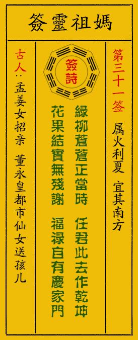 【台湾北海观音明善堂】正是杨柳苍翠成荫的时候,你应该把握时机,好好把握时机去闯天下,开拓事业,努力追求,自然会开花结果,天下事没有不劳而获的。顺应天时,一分耕耘,一分收获。积善之家必有余庆,福禄自然满家门。求得此签暗示目前福报俱足,问事求谋可期,若能更多行善公益,福禄更圆满。问事业:只要埋头苦干,必能成大业,此签具有蓄财(花果结实)繁荣(绿柳苍苍)等吉象,应好好把握。问婚姻,应努力追求积极把握。问功名,有金榜题名之兆。出外,移居,均大吉。是一首有大收获的吉签。问疾病,求神自安,医遇贵人。 【台湾育德妈祖同修会】正是杨柳苍翠成荫的时候,你应该把握时机,好好去闯天下。开展你的事业!好好耕种,自然会开花结果,天下事没有不劳而获的。一分耕耘,一分收获。积善之家,必有余庆,好好播种心田,福禄自然满家门!这是一首有大收获的吉签。但天下没有不劳而获的事,要收获,必须先耕种,只要你勤耕耘,必得大丰收。问事业,抽到此签,只要埋头苦干,必能完成大事业。此签具有蓄财(花果结实)繁劳(绿柳苍苍)等吉象,应好自把握之。问功名,有金榜题名之兆。出外移居,均大吉。有徐姓青年,听闻佘善解灵签,亦至妈祖庙抽得此签来佘处求解。佘问求签何为?该青年谓拟单枪匹马赴欧洲应聘。佘曰:“可行,将来必有成就。”二年后,该青年行必有成就。佘曰:“签诗明示‘任君此去作乾坤’,故之知。”该青年甚赞签诗灵验,并对佘善解签意,表示信服。  |