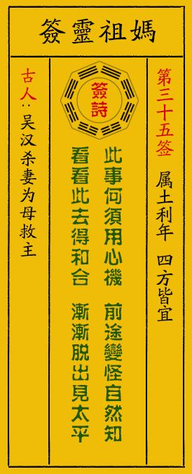 【台湾北海观音明善堂】无须再费心机为此事忧虑烦恼而猜疑,未来前途变化,你自然会知道。看看以后的结果是圆满和合的。现在开始,请渐渐抛开所有烦恼事情,等待时机到来,未来的变化,逐渐好转,不必再作无谓的担忧了。求到此签目前福报平平,问事求谋慢成,心绪不定易患得患失,自作聪明而丧失良机。如问婚姻,表示不用急,诚恳与耐心可获成功,是逐渐发展而得成功的幸福良缘。此签问求财,虽不十分理想,也有六七分以上的希望。问功名,有高中的吉象。诉讼官司,有获胜的希望,如受冤枉,亦有平反的机会。问疾病,命危险有鬼作祟阴邪元辰暗淡病深难愈拖尾,宜消灾解厄。 【台湾育德妈祖同修会】这件事情不必再用心机了,未来的变化,自然会知道的。看以后情形,当有和合的一天。从现在开始,已有转机,会渐渐脱出厄运,而看见太平的时光!这首签诗乃告示当事人所烦恼的事情,已有转机了。未来的变化。是渐渐变好,不必再担忧了。抽到此签,如问婚姻,表示不用急,有恒地推进,就可得到成功,是逐渐发展而得的幸福良缘。此签为求财,不能十分理想,也有六七分以上希望。问功名,有高中的吉象。诉讼官司,有获胜的希望。如受冤枉,亦有平反的机会。曾有某被告牵连抢劫案,其实系被误认冤枉,其家人甚担忧,至妈祖庙抽得此签,佘曰:“此签最后一句有‘渐渐脱出见太平’,应该会获叛无罪而被释放!”后果然逮到真正犯人而被释。  |