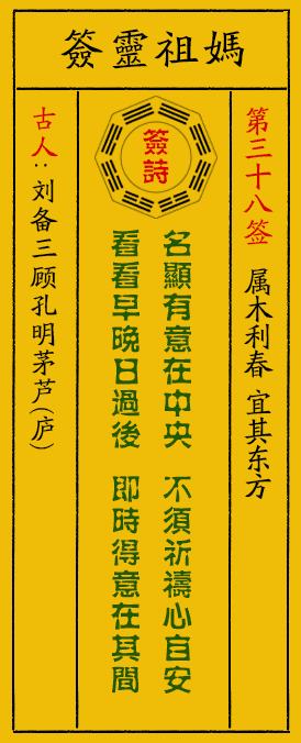 【台湾北海观音明善堂】不须太过执着目前的处境。只要坚定自己心中的目标,光明正大不偏不倚,名位自然显达圆满。不须要向神祈求,心里自然安祥。只要看看那早晚太阳的升沉,就会领悟到天地循环的道理,才能即时得意在其间。此签,乃告诉我们做人处世不宜太偏激执着,日有阴晴圆缺人有旦夕祸福,无须为一时的不如意太过在意。应采取乐观进取的态度,坚持目标循序渐进,常以失为得,自然能悠闲自得不会患得患失。求得此签暗示目前福报平平,问事求谋,需按部就班,不可冒进而增加无谓的困扰。问求财,宜守旧,不可贪求。心存正直。自然无忧。问谋事,虽有成功的希望,但时间上恐会拖延。谈婚姻,较迟。问诉讼,则以和解为宜。问疾病,未安,宜求神消灾解厄痊愈。 【台湾育德妈祖同修会】坚守中正立场,不偏不倚,名位自然显。不须向神祈求,心里自然安祥。看看那早晚太阳的升沉,就会领悟到,惟有坚守中间立场,才能即使得意起来。此签原意,乃告诉当事人,处世做人不宜太偏激,应该采取中庸的态度,这样,才能获得心安理得,人家也自然会敬重起你来。抽到此签,问求财,宜守旧,不可贪求。心中存着正直,自然无忧。问谋事,虽有成功的希望,但时间上恐久延。谈婚姻,在时间上为宜。问疾病,目前还无法痊愈,尚须待一段时间。友人张君,报名参加高考,不知能否高中,乃赴妈祖庙抽得此签。后高中金榜,分发经济部服务。经济部属中央级机关,正应了“名显有意在中央”句,真妙哉!  |
