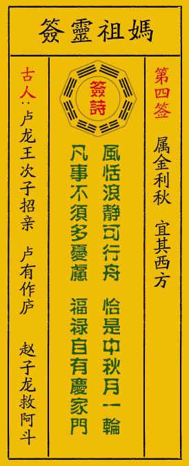 【台湾北海观音明善堂】风平浪静,船行无碍,就像中秋明月,圆满皎洁。凡事不必多忧虑牵挂,福禄自有也不须外求,等时来运转,自然喜庆满门。这是一首很幸运的签,表示一切能顺利如意,圆满达成。求得此签暗示目前福报稍有不足,问事求谋难成,机缘未到时易忧心烦恼,如果是应考之人,是金榜题名的好兆头。这首签诗除了表示功名有望,福禄齐全外,如问诉讼,表示要走的正。如问婚姻,表示和谐美满。如问移居,一切顺利安康。问疾病,祈神消灾近日痊愈。 【台湾育德妈祖同修会】风平浪静,船行一帆风顺,正像中秋明月,圆满皎洁。凡事不必多忧虑,福禄自有不必求,时来运转,自然喜庆满门。这是一首很幸运的签诗,表示一切顺调如意,圆满达成。如果是一位应考的人,抽得此签,是金榜题名的好兆。这首签诗除了表示功名有望。福禄全。如诉讼,表示得直。如问疾病,可以痊愈。如问婚姻,表示美满。如问移居,一切安好。  |