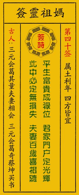【台湾北海观音明善堂】俗云:“生死有命,富贵在天。”一生只要有富贵之命,必可求得,也一定能光耀门楣。家和万事成,只要姻缘和合,夫唱妇随,一定不会有损失的。此签问求财,可顺利达到目的。问功名,有金榜题名的吉兆。问婚姻,乃和好顺利幸福良缘。问谋事,则须多下番功夫。问诉讼,以和为贵。求得此签暗示福缘俱足,问事求谋可期,应感谢天地神明恩赐,也暗示姻缘富贵已有定数,人事已对,只须要再待机缘成熟,大好姻缘指日不远。功名富贵也必能光宗耀祖。问疾病,求神渐愈,老,妇人危险。 【台湾育德妈祖同修会】古云:“生死有命,富贵在天。”平生只要有富贵之命,一定有禄位可求,也一定能光耀门楣。家和万事成,只要夫妇百年和合,夫唱妇随,一定不会有什么损失的!某君因其妻未生男,欲纳偏房,乃至妈祖庙求卜,得此签,一见“夫妻百岁喜相随”,乃作罢,家庭因而因而免于破裂,其后竟得一男,正应了“此中必定无损失”句。此签问求财,乃得顺利达到目的。问功名,有金榜题名吉兆。李君参加特种考试,夜梦乘金龙上天,不知主何吉凶,乃赴庙求签,得此签,果高中金榜,正应了前二句“平生富贵成禄位,君家门户定生辉”。此签问婚姻,乃和好顺利与幸福之良缘。问谋事,则须下一番功夫。问诉讼,以和为贵。  |