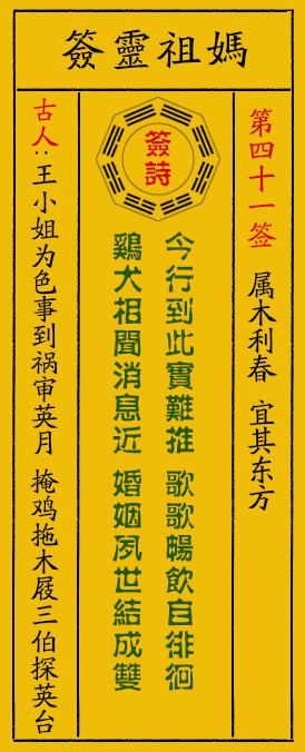 【台湾北海观音明善堂】你来求问,神明很难推辞。其实,就快要有好消息了,有缘千里来相会,何必犹豫不决呢?求得此签暗示目前福报圆满,问事求谋可成,更加要多拜神作福为善来延续功德福报。答谢上天厚爱恩赐。此签另暗示有双的意思。暗示双喜临门或对象会有二择一之兆。这是一首告诉当事人不要犹豫的签诗,做任何事都该当机立断,会有好消息的。问求财,平平。问功名,有金榜题名之兆。问婚姻,有情人终成眷属。问疾病,求神自安,幼,妇人拖尾危险。 【台湾育德妈祖同修会】多年来辛苦经营的刚有了成果,但又有人求让,实在不好推辞,心里矛盾,借酒消愁,还是难取舍。其实,就有好消息了,所谓“有缘千里来相会”,何必犹豫不决呢?这是一首告诉当事人不要犹豫的签诗,做任何事都应该当机立断。只要你能当机立断,总会有好消息的。此签问求财,平和而已,问功名,有金榜题名之兆。曾有某君赴考抽得此签。佘曰:“此签指示八九月间会有好消息。”鸡为酉,即八月,犬为戌,即九月,后果然高考及格。又有一对男女抽得此签来问婚姻,佘曰:“此签指示婚姻可成,因最后一句“‘婚姻夙世结成双’,不是很明显吗?”后果结成美满幸福良缘。  |