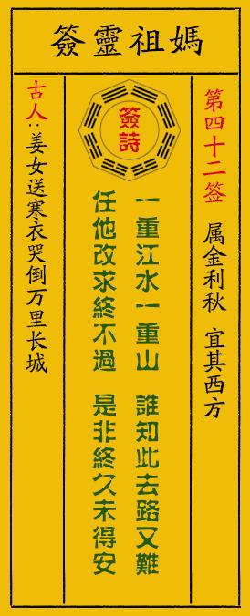 【台湾北海观音明善堂】这件事恐怕很难解决,摆在眼前有着重重的困难与砠碍,不是轻易可以冲破的。就像过了一重江水,又有一重山,道路崎岖不平,进退不易。任你有任何办法,也不能挽救,是非终究要发生。求得此签暗示目前福报不佳,问事求谋不可,应求神排解。目前运气很差,正朝遇困难重重,正值进退两难之间。此时应该坚定立场,固守正道,忍辱自重,以等待时机的到来。此签问求财,毛病百出,终至亏损,可暂时罢手以待有利时机。问功名,遇到难题,尚须努力充实自己。问婚姻,阻碍重重,双方如无真爱,宜及早另找对象。问诉讼,有严重的麻烦,且拖延时间,罢手为妙。问疾病,命危险有阴邪元辰暗淡,宜消灾解厄。 【台湾育德妈祖同修会】这件事恐怕很难很难,有重重的阻碍,不是轻易可以冲破的。正是过了一重江水,又有一重山,此去道路崎岖不平,实在难走。任你有办法改变,也不能挽救,是非终究要发生。抽到此签,表示气运闭塞不通,艰难困苦重重,进退维谷。此时应坚定立场,确守正道,容忍自重,以等待时运的解通。此签问求财,毛病百出,终致亏失,暂时罢手以待有利时机。问功名,遇到难题,尚须充实自己。问婚姻,阻碍重重,如无真正爱情,及早另找对象。问诉讼,严重的麻烦,且拖延时间,罢手为妙。问疾病,严重危险,用心治疗或有奇迹。  |