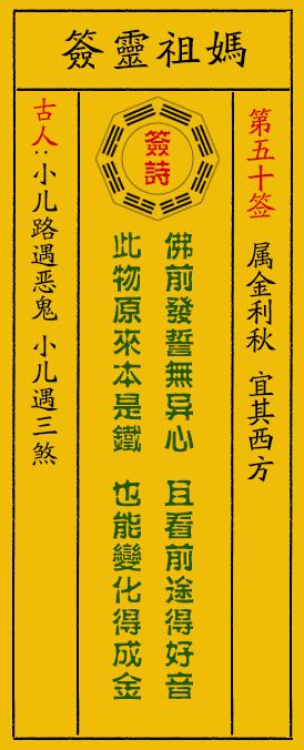 | 诗曰 | 佛前发誓无异心、且看前途得好音、此物原来本是铁、也能变化得成金。 |
