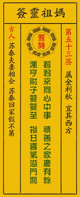 | 诗曰 | 看君来问心中事、积善之家庆有余、运亨财子双双至、指日喜气溢门闾。 |