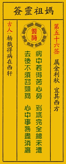 【台湾北海观音明善堂】一个人在病中,若还要苦思操劳一些还未遭遇的事,只会把自己弄得更患得患失,那是多痛苦的事啊。世事古难全,应该快乐的过日子。事情过了就算了,不必回思过去,也无须再多问,把心中的念头尽量打消吧。这首签诗,主要在安慰当事人尽量把心放宽,注意身体健康。所谓:“留得青山在,不怕没柴烧。”即使事情失败了,也不必患得患失,那样将于事无补,于己有损,何苦来哉。求得此签暗示暗示目前福报不足,问事求谋难成,不利缘份,福禄,易胡思乱想。应当转好念、行好事、发好愿、才能转安得福。问求财,表示财运未到,再操心也没用,就顺其自然吧。问功名,全无希望。问婚姻,无法成功。问疾病,先凶后吉,求神平安。 【台湾育德妈祖同修会】人在病中,若还要苦心操劳,那多痛苦。其实,要找完全合乎理想的,本来就未有人遭遇过。事情过了就算,不必回头再去追问它,心中有事尽量打消它吧!这首签诗,主要在安慰当事人尽量把心放宽,注意身体健康。俗云:“留得青山在,不怕没柴烧。”即使事情做失败了,也不必患得患失,尽把它挂在心上,结果于事无补,于已有损,何苦来哉!此签问求财,表示财运未到,再操心也没用,就顺其自然吧。问功名,成绩差,希望不大。问婚姻,恐不容易成功。曾有某小姐,因为男友出国未返,抽得此签来求解。佘曰“此签凶多吉少,贵男友恐怕已变心了。因为签中有‘去后不须回头问’句,恐怕他已把你忘掉!”后果然。  |