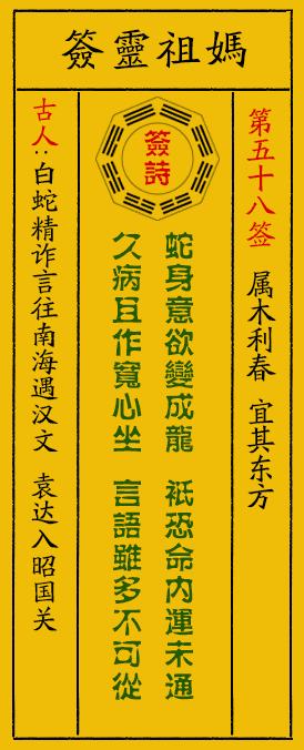 【台湾北海观音明善堂】蛇身要想变成龙,只恐命里运气还未通,那是不可能达到目的。还是宽心调养虚弱的身息,宽心地等待吧,虽然别人意见很多,但是不要随便相信听从。此签告诉当事人,运气停滞未通,做事多阻碍,万事不尽如意。但不要悲观自暴自弃而堕落,要忍耐奋斗等待有利时机来临。求得此签暗示目前福报欠佳,问事求谋,劳心劳力又徒劳无功。应求神行善善作福。问求财,小钱有,大钱不能获得。问功名,成绩欠理想,难达成愿望。问婚姻,障碍多,不易成功。问诉讼,恐拖延时间,而且胜败反覆不定。出外移居,一动不如一静,均不吉。问疾病,不愈拖尾,宜求神消灾解厄。 【台湾育德妈祖同修会】蛇身要想变成龙身,只恐命里运气未通,那是不可能达到的。病久虚弱的身体,还是宽心地等待,不要自不量力。虽然意见很多,还是不要去听从。此签告诉当事人,运气停滞未通,做事阻碍多,万事不如意。不要悲观自暴自弃而堕落,忍耐奋斗以等待有利机会的到来。问求财,小钱有,大钱还是不能获得。问功名,成绩欠理想,难达成愿望。问婚姻,障碍多,不易成功。如果强求,反而得不到美满姻缘。问诉讼,恐拖延时间,而且胜败反覆。出外移居,一动不如一静。均不吉。  |