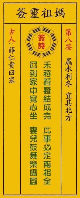 【台湾北海观音明善堂】田里的稻穗累累,辛苦的汗水与耕耘,将有丰盛的收获。看到好的收成,心中的忧虑烦恼尽除,终于可以安心的回到家里跟妻儿们快快乐乐地载歌载舞。这首签诗表示,有一分耕耘,终有一分收获。昔日流汗,今天总算看到丰收了。但如果没有往日的流汗,那有今天的收成呢?求得此签暗示目前福报俱足,问事求谋大抵先苦后甘,先否后泰。问婚姻,表示有情人终成眷属。问事业,要脚踏实地去做,不可投机,投机必败。问功名,如在秋天,有希望,如在冬天,须待明年。问疾病,宜消灾,老危险。 【台湾育德妈祖同修会】看看田里结成了稻穗,知道今年又丰收了。辛勤的耕耘,必有丰盛的收获,这事是两相关的呀!看好的收成,心中多高兴,回到家里来,跟妻儿们同在一起,快快乐乐地跳舞一番!这首签诗是一首好签,表示有一分耕芸,终有一分收获。俗云:“大富由天,小富由勤俭。”昔日的流汗,今天总看到丰满的收成了。但如果没有昔日的流汗,那有今天的收成呢?抽到此签,大抵先苦后甘,先否后泰。如果是问婚姻,表示有情人终成眷属。问事业,要脚踏实地去做,不可做投机,投机必失败。问功名,如果在秋天,有希望。如果在冬天,须待明年,再充实自己。  |